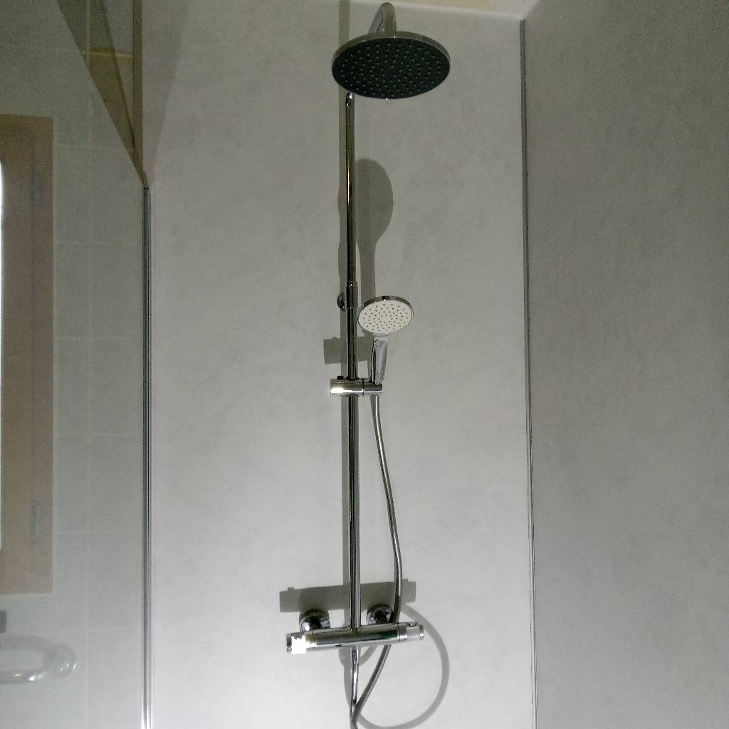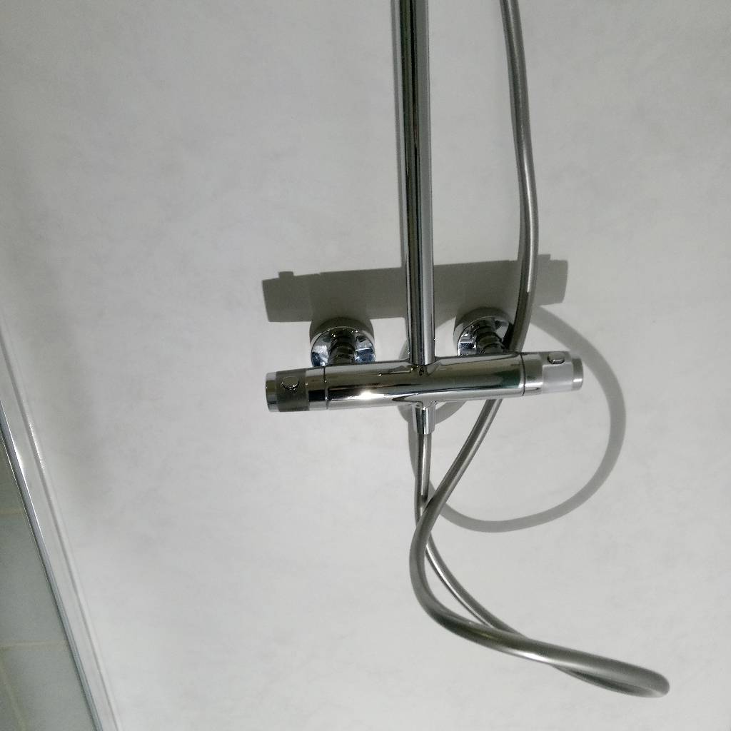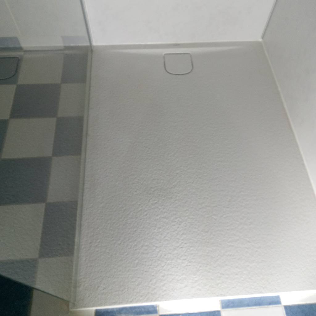 Reprise des arrivées d'eau froide et chaude, mise en place d'un nouveau bac à douche extra-plat de 90 cm x 120 cm (MacBath), pose de parois synthétiques de la marque Roth, panneaux Vipanel, pose d'une paroi vitrée de 120 cm x 200 cm et pose d'une colonne de douche Valmont de la marque Ramon Soler.
